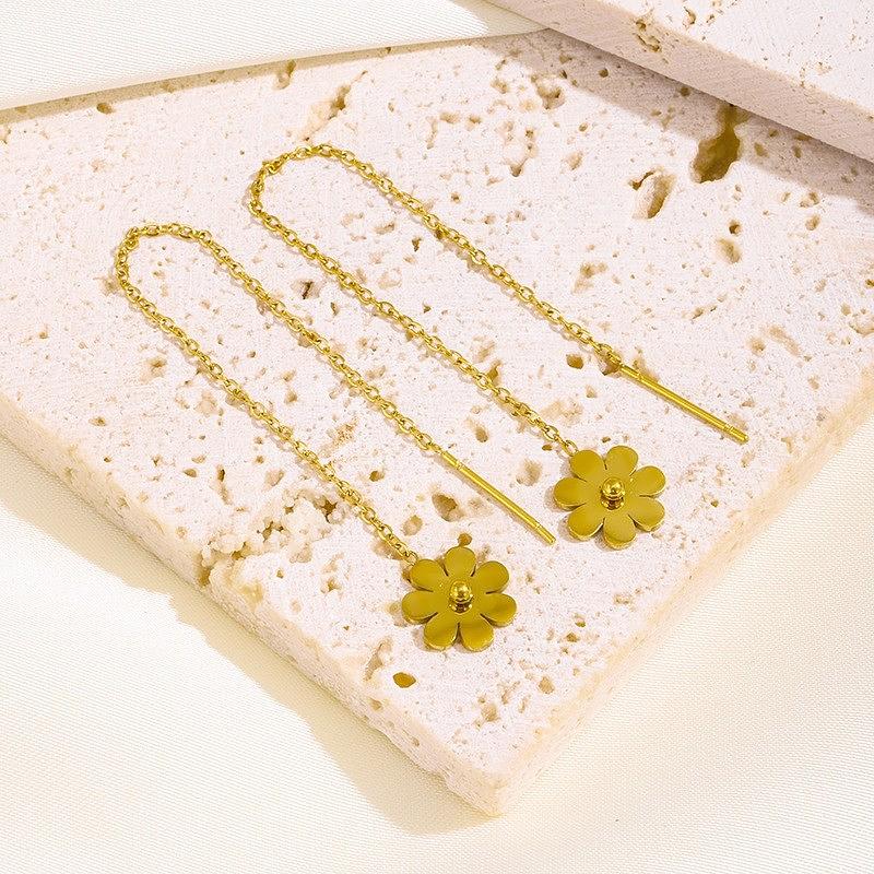 Novos brincos longos de flor em aço inoxidável 18K, simples e elegantes.