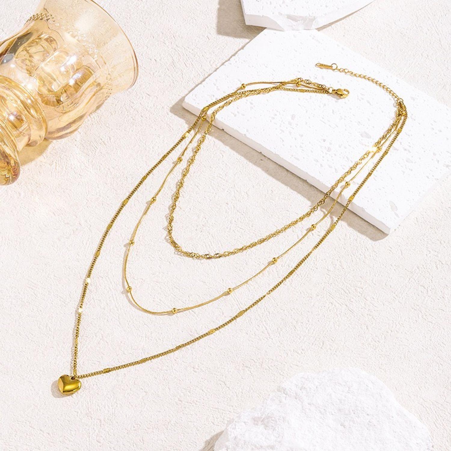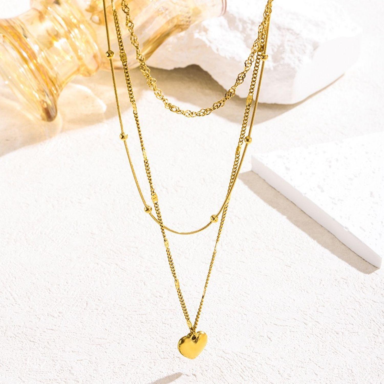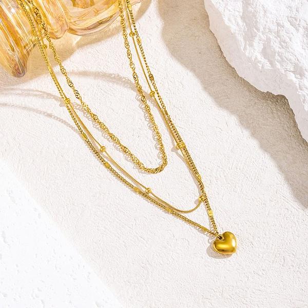 Colar de três camadas com pingente em forma de coração em aço inoxidável 18K, estilo popular europeu e americano, resistente ao desbotamento, corrente de clavícula sofisticada e elegante, corrente de contas redondas.