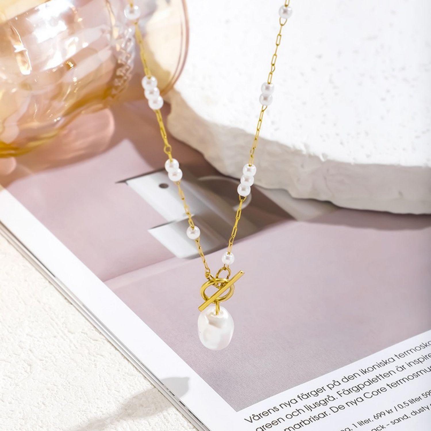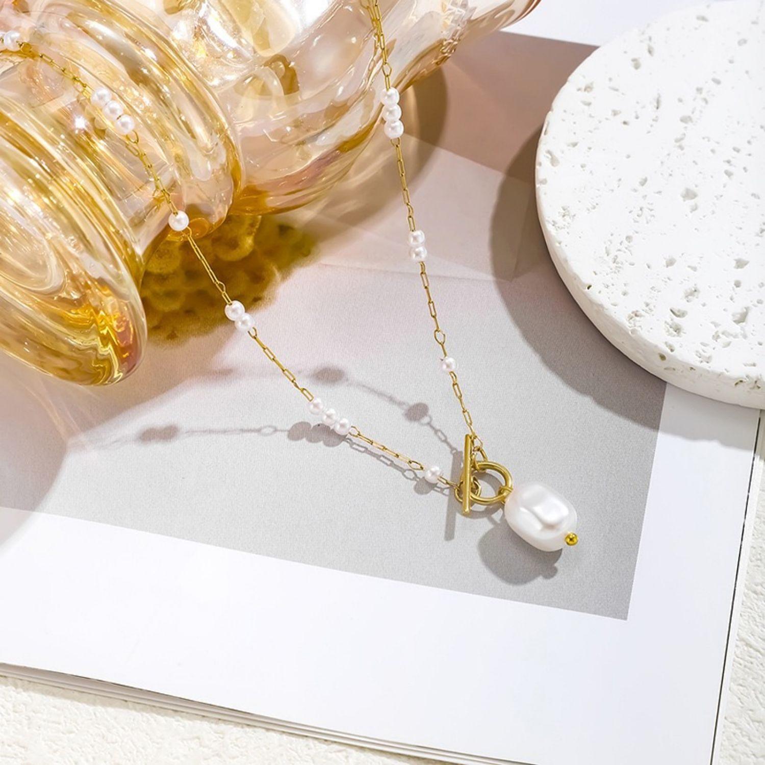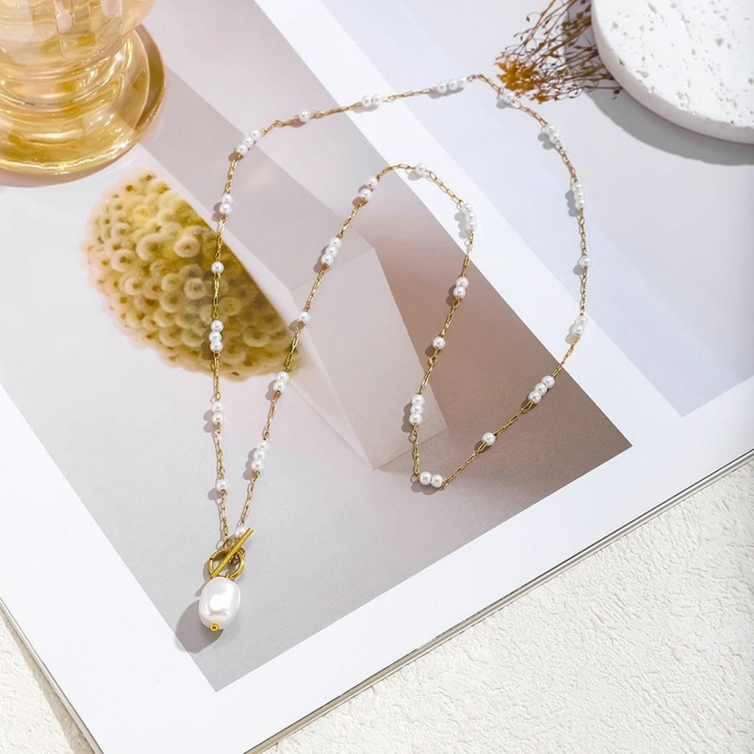 Novo colar feminino de luxo leve com pingente de pérola e fecho em T, em estilo europeu e americano, design exclusivo, joia elegante em aço inoxidável 18k.