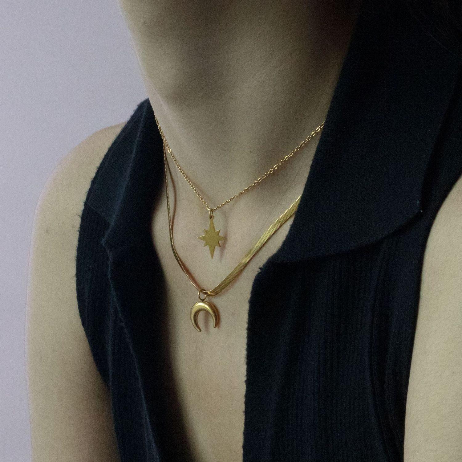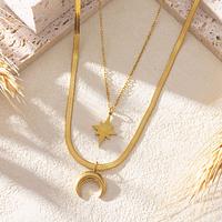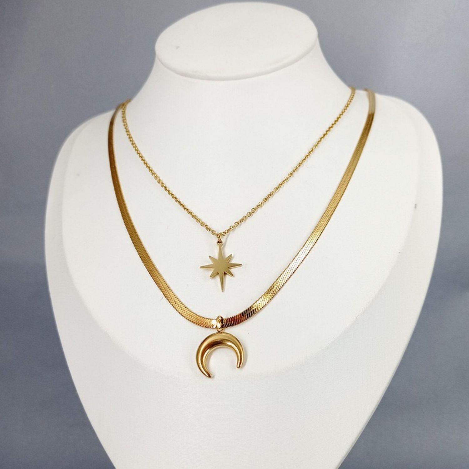 Colar em aço titânio 18K, dupla camada, resistente ao desbotamento, joia moderna e exclusiva com design de lua e estrela.