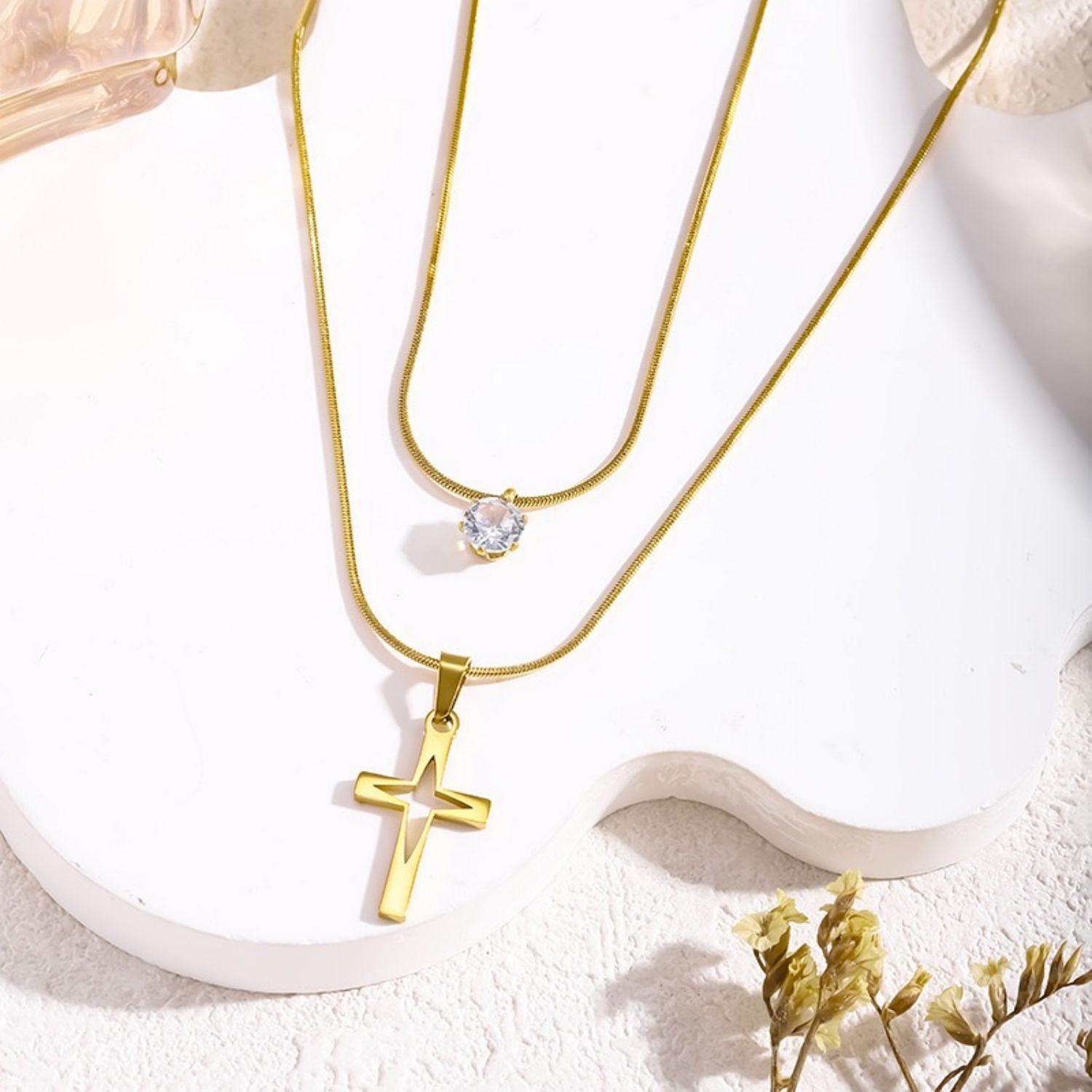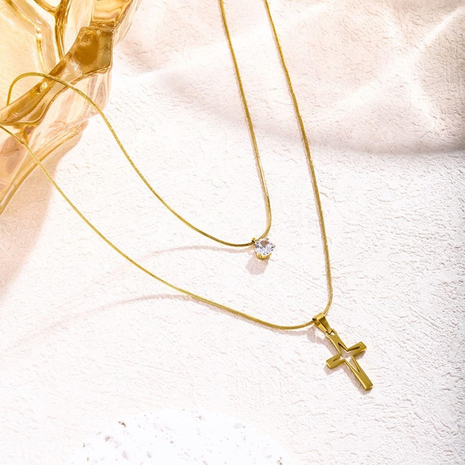 Novo colar de aço inoxidável 18K com pingente de cruz em estilo europeu e americano de duas camadas
