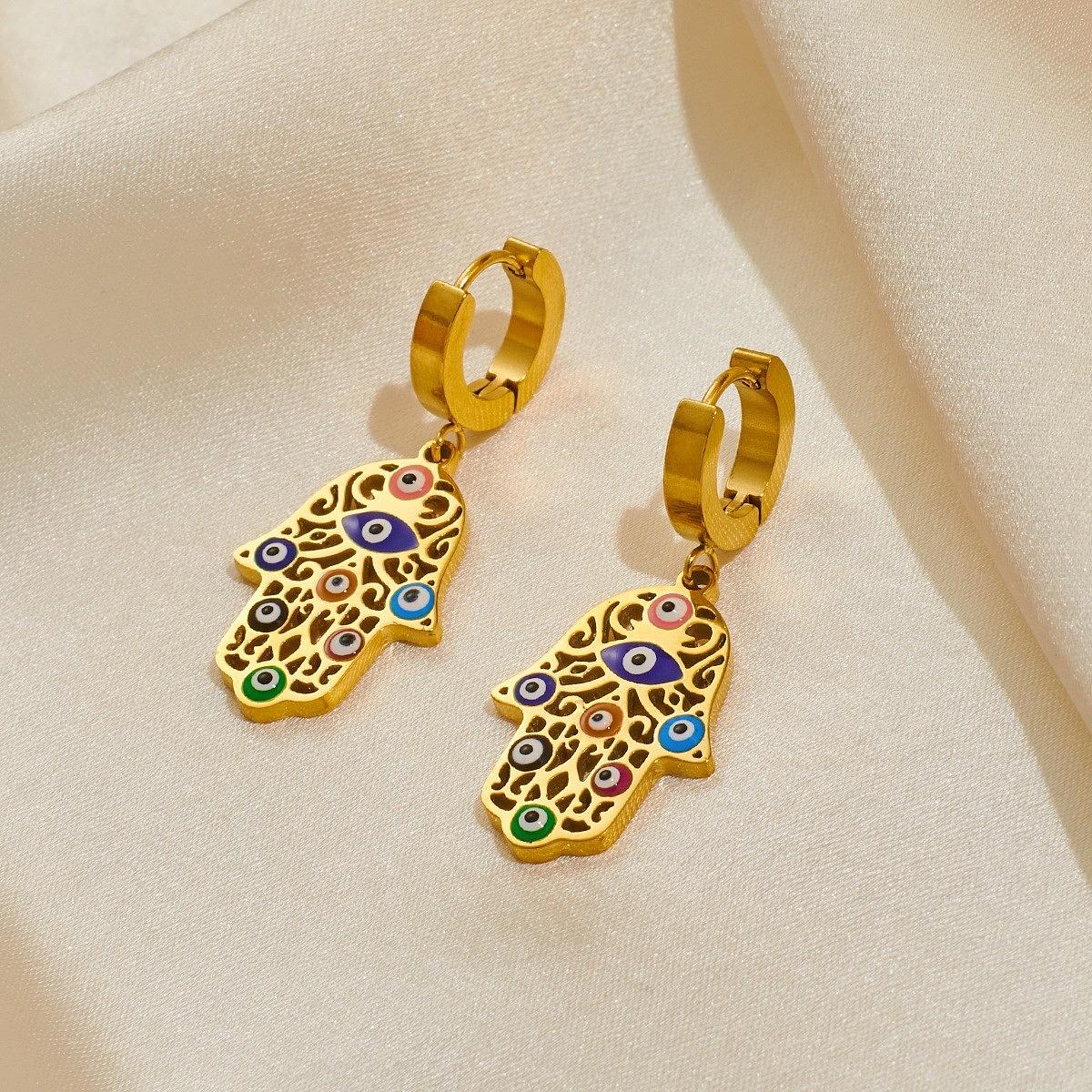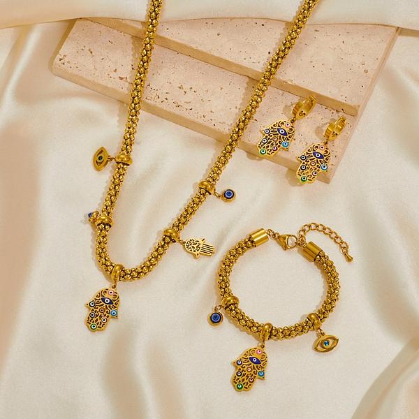 Novo conjunto de colar, pulseira e brincos em aço inoxidável 18K, da marca Fatima Hand, com produção internacional (Europa e Estados Unidos), cores resistentes ao desbotamento, moderno, elegante, versátil e luxuoso.